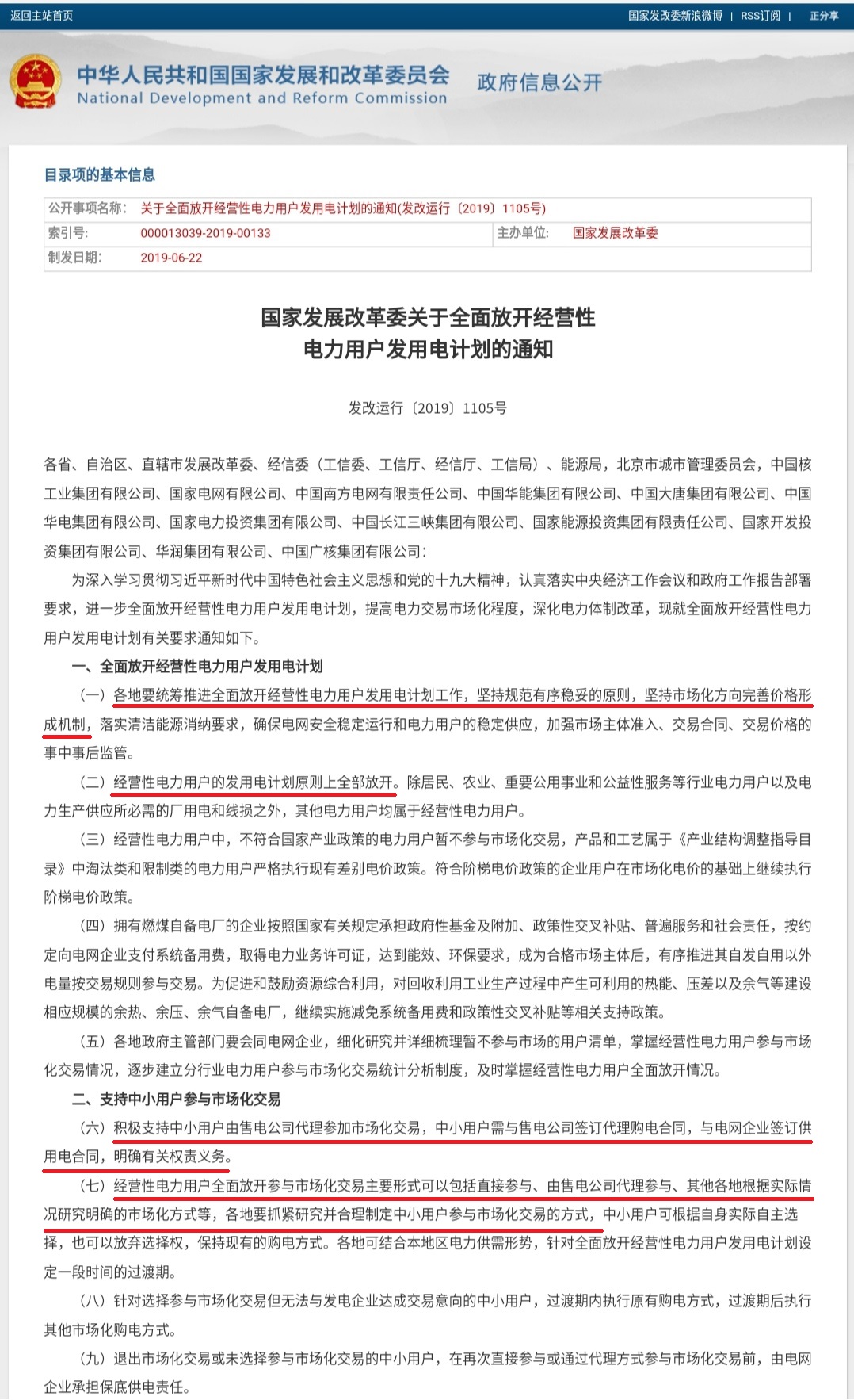 2019年6月22日國家發改委下發《關于全面放開經營性電力用戶發用電計劃的通知》(發改運行【2019】1105號文)。積極支持中小用戶由售電公司代理參加市場化交易,中小用戶需與售電公司簽訂代理購電合同。